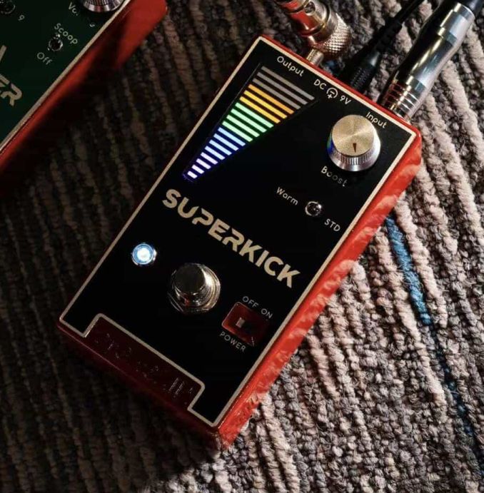 Superkick is a booster pedal featuring an original design with an independent signal level indicator. When powered on, whether the booster is activated or in bypass mode, the level light remains operational. This allows you to visually monitor changes in input level, offering an additional dimension beyond auditory perception—enabling you to observe volume variations across different guitars, pickup settings, playing dynamics, and before/after engaging the booster
