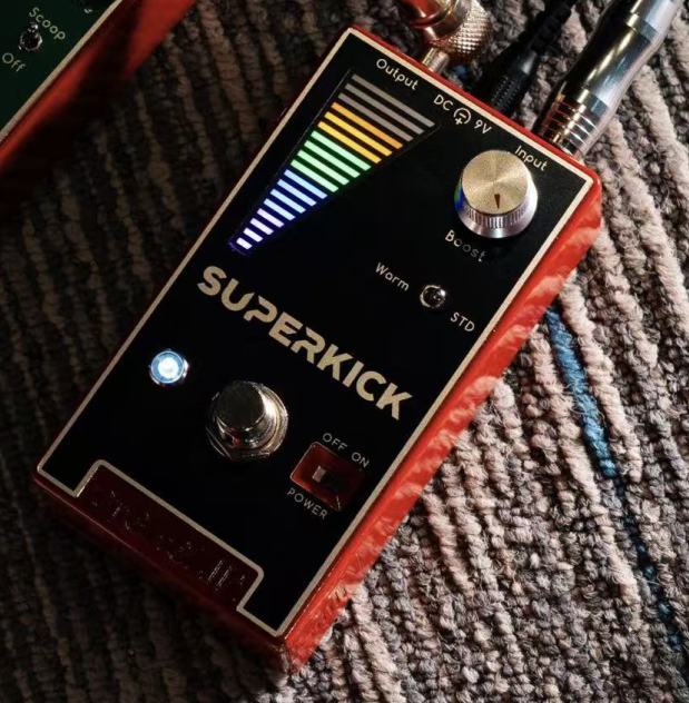Superkick is a booster pedal featuring an original design with an independent signal level indicator. When powered on, whether the booster is activated or in bypass mode, the level light remains operational. This allows you to visually monitor changes in input level, offering an additional dimension beyond auditory perception—enabling you to observe volume variations across different guitars, pickup settings, playing dynamics, and before/after engaging the booster